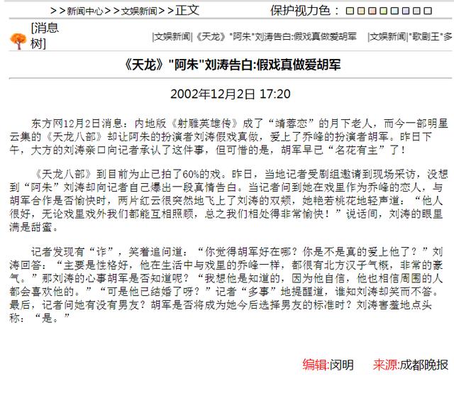 没有想到,两人竟然还延续到了戏外,面对两人的绯闻,刘涛也是大方承认了这件事情,假戏真做的爱上了“乔峰”胡军。
