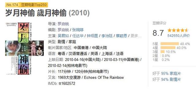《岁月神偷》的剧情其实简单而煽情。既没有大时代下的风起云涌,也没有波澜壮阔的史诗气概。但在充满怀旧气息的老香港的时代背景下,充满情怀。任达华收起了悬疑恐怖片中凶神恶煞的表情,吴君如也不再像喜剧片中那样疯癫夸张。把香港小市民演得如此生动,让人感动。
