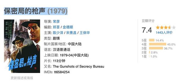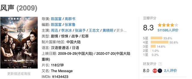 目前,在豆瓣上还有着8.3分的好评,排在今天盘点的谍战片第二名。