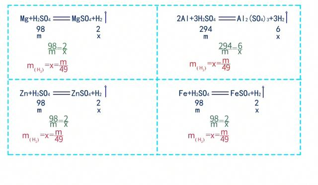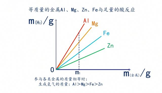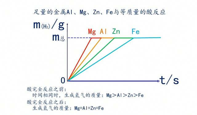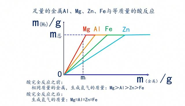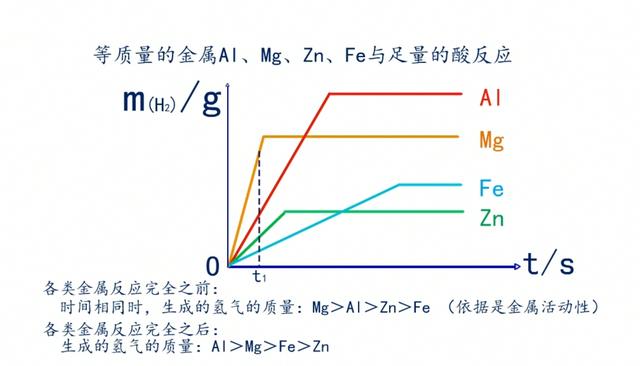 中学阶段:等质量金属Mg、Al、Zn、Fe分别与足量的同种酸反应生成氢气的速度和质量的判断;以及足量的金属Mg、Al、Zn、Fe分别与等质量的同种酸反应生成氢气的速度和质量的判断。