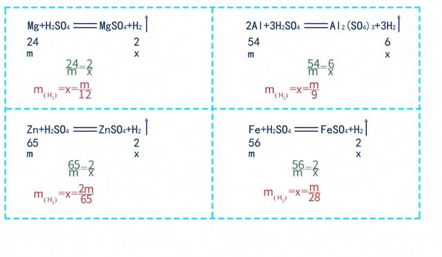 各类金属反应完全后产生气体由多到少:Al>Mg>Fe>Zn
