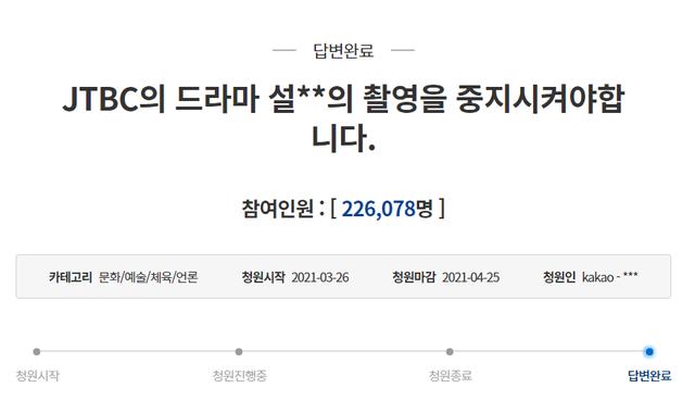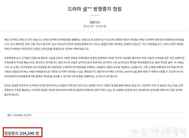 当地时间12月19日,有韩网民向青瓦台网站提交了一份新的在线请愿书,要求该剧停播,截至当地时间12月20日上午,已有超过23万人参与请愿。